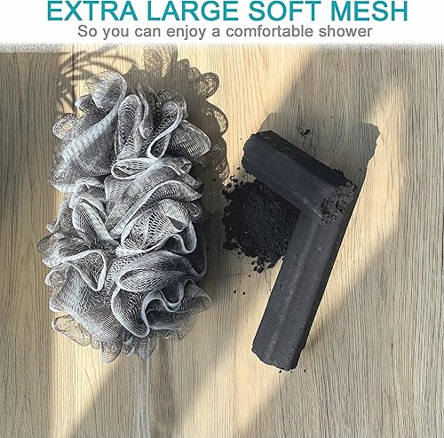 Charcoal Back Scrubber Set - 2pc Long Handle Bath Brush & Pouf