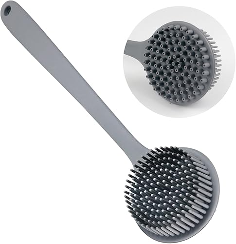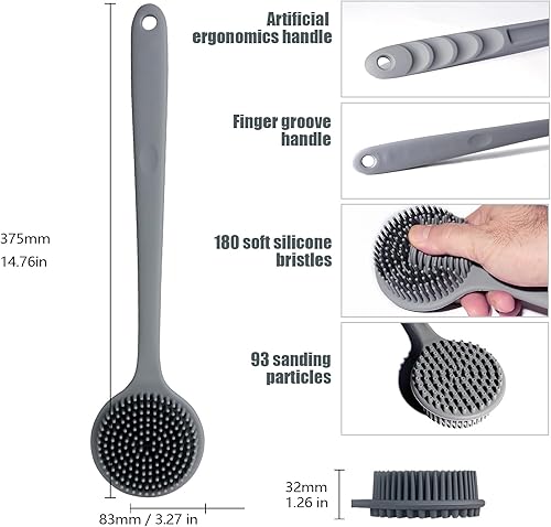 Long Handle Back Scrubber - Gray Silicone Body Brush for Shower