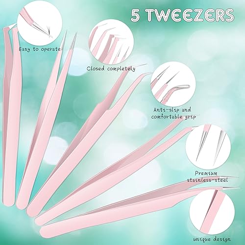 Chumia 5 Pcs Eyelash Extension Tweezers Set - Pink Stainless Steel
