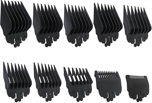 Package List: 10Pcs Black guards with cutting lengths ranging from 1/16" to 1", providing versatility for various hairstyles and grooming needs