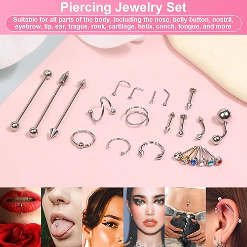 【Body Piercing Jewelry Bulk】These piercing jewelry set include all piercing items like cartilage barbells, septum rings, tragus barbells, tongue studs, labret rings, belly button studs, and eyebrow studs. etc. Each body piercing jewelry has been carefully selected, so your charm can be perfectly displayed after using this piercing kit