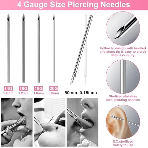 【Helpful Piercing Tools】The body piercing kits include various gauge sizes of body piercing needles for specific piercings, which are much sharper, and experience less pain than a piercing gun, which is a better choice for body piercing. The septum clamps hold the skin steady and in place during the piercing process