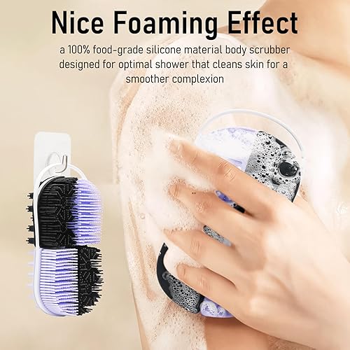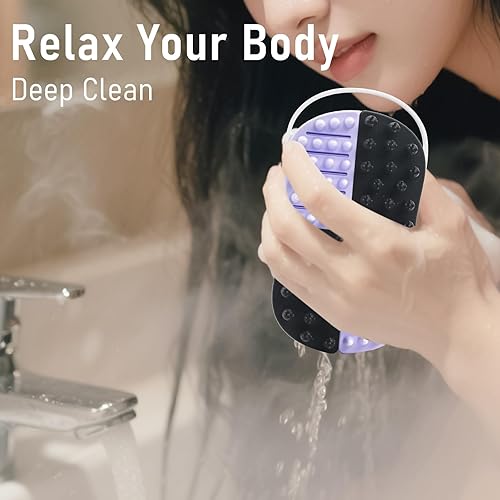 Dual-Sided Bathing Brush: Mabnuby Silicone Shower Scrubber for body features 2 sides sudscrub - soft long bristles for body massager & cone brush for scalp hair massage scrub. The Advanced intensive bristles are not easy to deform, daily skin care.