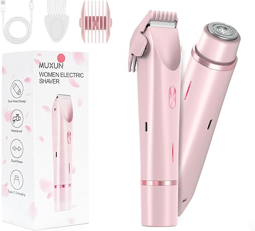 [Double headed 2-in-1 design]:MUXUN women electric bikini trimmer adopts an innovative 2-in-1 dual head design, which can meet the trimming of hair on various parts of the body. With a push scissor head, it is suitable for trimming hair on the arms, legs, bikini area or other parts of the body; A 3D floating razor that can be used to remove hair from the cheeks, chin, and lips. One machine meets different shaving needs, bidding farewell to tedious tool replacement