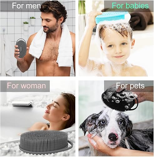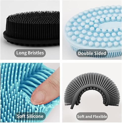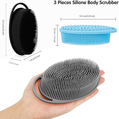 Functional: The bristles of our body scrubber are soft and tough to clean your sensitive and all kinds of skin. It can be as a shower scrubber, facial brush, massage brush. It also can be as a dish brush in your kitchen if you need. These silicone body brush for showering are great gift for family and friends. Suitable for men, women and all. Set of 3 combinations of different colors