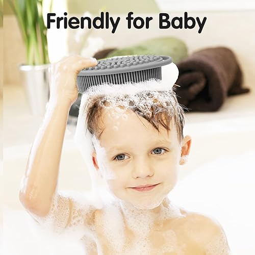 Easy to Use: The silicone shower scrubber for body does not absorb water, easy to clean and dry quickly. The Silicone bath scrubber is also and high temperature resistant, so you can clean it in hot water. The side of soft long bristles can suit for sensitive and all kinds of skin, even babies' skin. Replace your traditional loofah with soft body bath brush