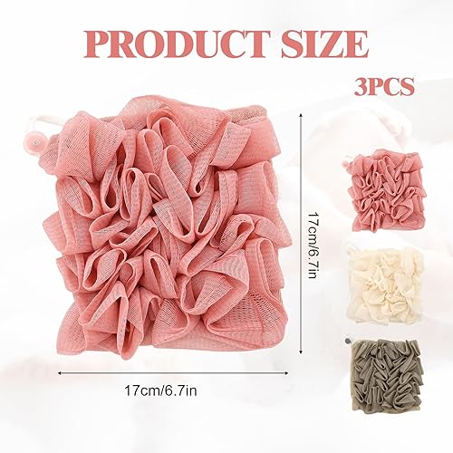 Stylish and Versatile: Elevate your bathroom decor with our set of 3 soap bar loofah in trendy colors: Khaki, Coffee, and Pink. The variety of colors allows you to choose the one that best matches your personal style or bathroom theme. With enough pieces to meet your daily needs, these soap loofah pouch are not only functional but also add a touch of elegance to your space.