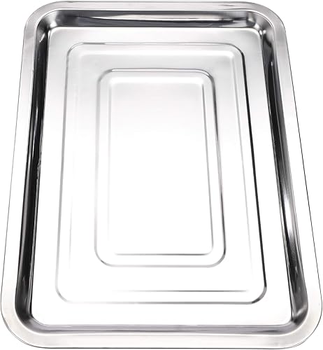 3.SIZE - It is sold by 3 packs stainless steel tray for machine tool kit.Stainless Steel Instrument Tray size is 13.5" X 10". (Length: 13.7", Width: 10.2", Depth:0.79").Stainless steel trays rectangle