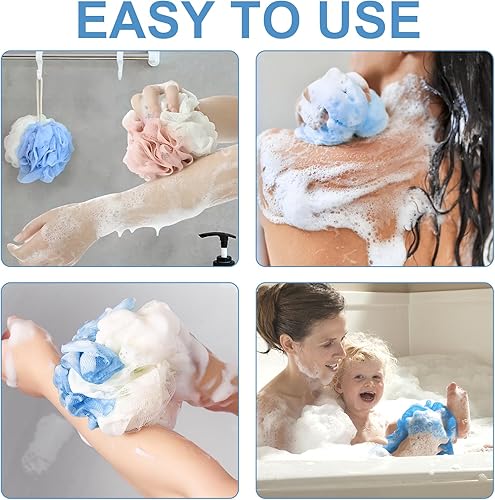 【Convenient Hanging Loop】:Each shower pouf features a sturdy loop for easy drying and storage, helping to keep your bath sponge clean, dry, and ready for the next use