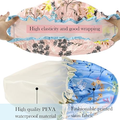 Double-Layer Waterproof: our shower caps are made of satin fabric and with PEVA lining, which keeps your hair dry in your shower time, no water droplets drop on forehead or neck dry, upgrade your shower experience.