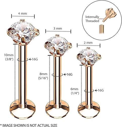 • PERFECT FIT: Tragus, Labret, Cartilage, Helix, Conch, Lip, Monroe, Medusa. SIZES: Gauge - 16G (1.2mm), Length - 6mm (1/4"), 8mm (5/16"), 10mm (3/8").