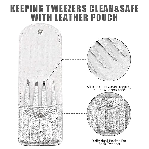 ❤ 【Best Gift With Exquisite Leather Case】 - The portable high class leather case make this professional tweezers set great for emergency usage,it comes with a little leather case,each tweezer has a individual pocket to keep eyebrow tweezers clean and not as easy to lose,With silicone tip cover to keep tweezers safe.The leather case is portable and lightweight that slips easily into pocket, purse,gym bag,Stylish with convenient travel case aslo is the best gift for your lover or firend.