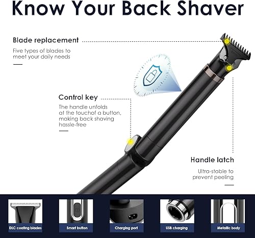 Retractable & Extended & Removable Handle: This back hair trimmer comes with a 180°adjustable handle (button lock can help you fix it to the desired angle), which allows you to easily remove hair from different areas of your back without anyone's help through the retractable, removable design.