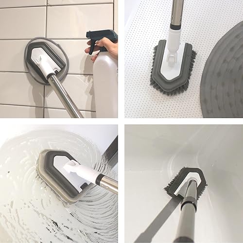 ADJUSTABLE NON-SLIP LONG HANDLE - The handle of the floor scrub brush is a combination of four stainless steel handles with non-slip pads on each section to enhance the comfort of the tub tile scrubber brush during use. The retractable handle of the floor scrub brush can be adjusted from 38.98 inches to 51.57 inches to suit different needs without the need to bend, stretch or crouch. Shower brush reducing the burden during cleaning tasks.
