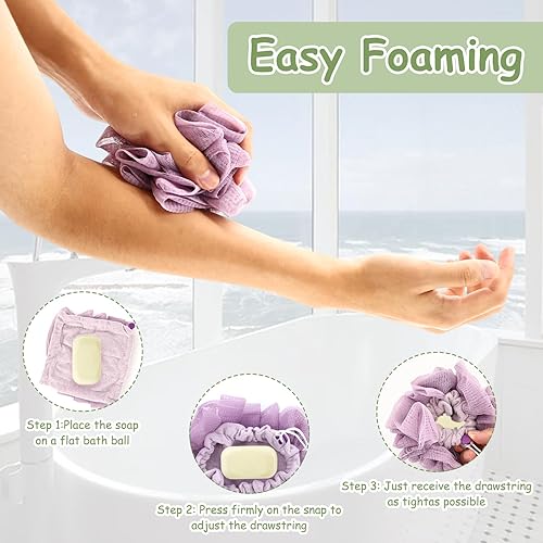 【Luxurious, Deep-Cleansing Lather】Indulge in a spa-like foam bath every day. The dense structure of our loofah pack generates a remarkably rich lather that penetrates deeply. This generous sudsing action from the bar soap loofah pouch effectively lifts away dirt, oil, and impurities, providing a thorough clean. The soap bar loofah's high-density weave ensures maximum foam output for a refreshing and invigorating wash.