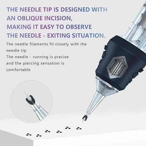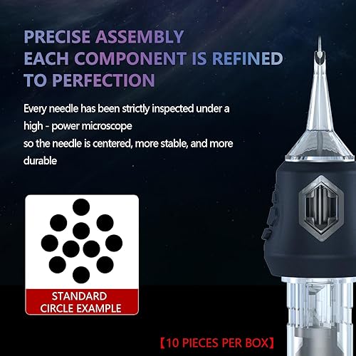 Complete Packaging: 50 pcs mixed-pack #12 tattoo cartridge needles, includes 5 pcs each of 1203RL,1205RL, 1207RL, 1209RL,1211RL,1205RM,1207RM,1209RM,1211RM,1213RM.The unique design of the needle can store more ink, and the sharp needle thread better completes tattoo activities, suitable for both professional tattoo artists and beginners.