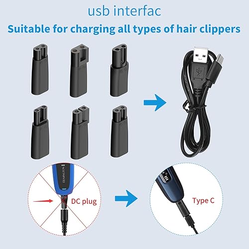 USB to Typc C connection, 6 kinds of adapters for you to choose, fits most shaving trimmers. The USB port on one end of the charger can be used with the charging head, also can be connected to mobile power, laptop and other USB devices. (please check the adapter interface carefully to make sure it matches)
