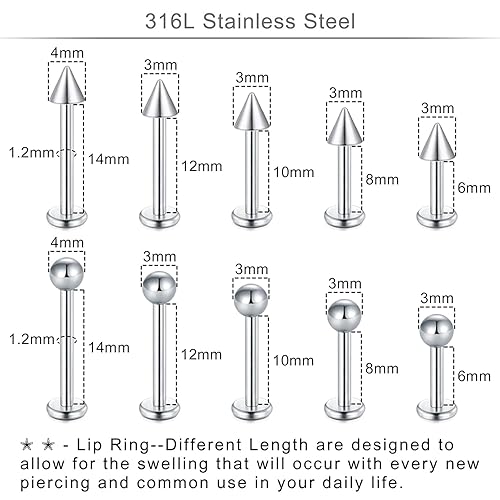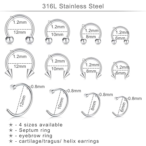 BODY PIERCING JEWELRY SET: Total 75pcs with different sizes to meet your personal demand. 3pcs belly button ring (14Gauge=1.6*6/8/10*5/8mm); 4pcs-C-shaped nose ring(20G=0.8*6/8/10/12mm) ; 8pcs-Clicker nose ring and captive ring (16G=1.2*8/10/12mm); 8pcs-horseshoe nose ring; 8pcs-industrial barbell; 4pcs-eyebrow ring; 5pcs-lip ring; 8pcs-nose screw studs; 8pcs-ball replacement.