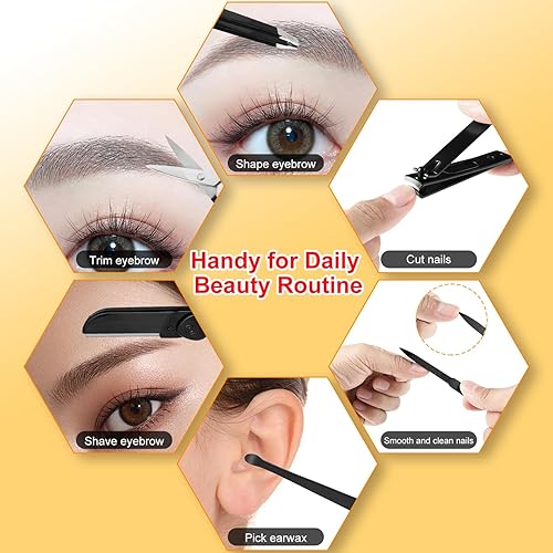 Value Tweezers and Clippers Set: 9pcs tweezers set come with 4 precision stainless steel eyebrows tweezers,1 curved eyebrows scissors, 1pcs eyebrow razor, 1pcs nail clipper, 1pcs nail file and 1pcs earpick. Each tool is elaborately made and can meet all kinds of daily care needs in daily life,one set in the hand,living at ease.