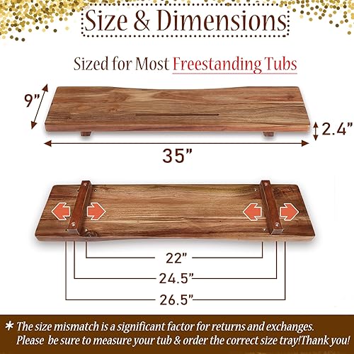 【Large and Solid Wood Bath Tray for Tub】 The size of this bathtub caddy is 35"L *9"W *2"T, has large space to hold your SPA essentials. 2" thickness solid wood can sustain more than 200 pounds, even you can use it as a shower bench and sit on it! There are adjustable legs to fit different size bathtub, the legs width are 22", 24.5" and 26.5". [PLEASE kindly measure your bathtub size to make sure the tray is fit your bathtub before purchase.]