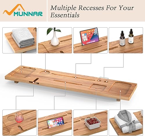 【MULTIFUNCTIONALITY】MUNNAR bathtub trays are equipped with slots for cell phones, tablets, wine glasses, etc., which are easy to access when taking a bath. The grooves designed for essential oils, scented candles, towel bath balls, soaps, etc. keep items stable. Versatility keeps all bath essentials within reach.