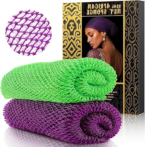 PACKAGE CONTENTS: Set of 2 premium African net sponges in attractive purple and green colors for full-body exfoliation and cleansing