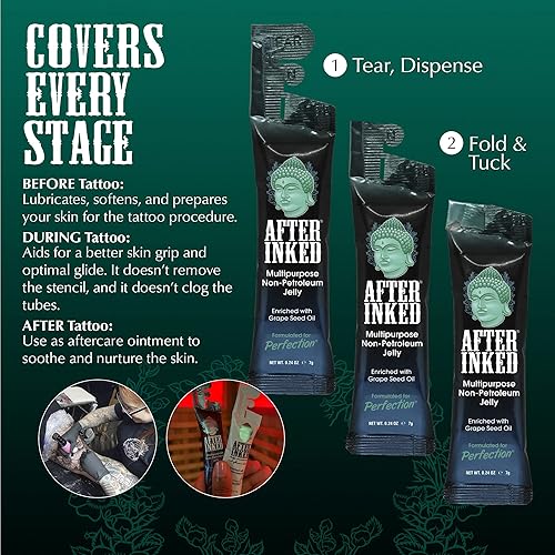 RADIANT TATTOO AFTERCARE: After Inked Non-Petroleum Jelly improves your tattoo's brilliance. Enriched with grape seed oil and antioxidants, our tattoo aftercare jelly provides the essential hydration that your skin needs. Reveal the true vibrancy of your tattoo's colors and cherish its artistic beauty.