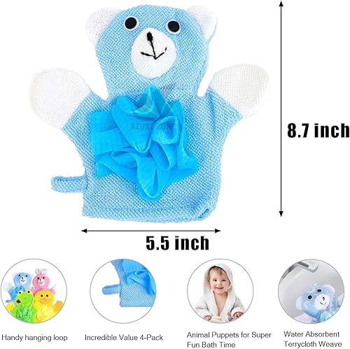 Animal Bath Mitts 4-Pack - Cartoon Hand Puppet Wash Towels