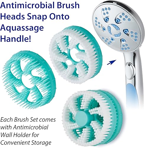 BETTER SHOWER HYGIENE - No more shower clutter with messy bath brushes, sponges, poufs, and loofahs filled with soap scum that often create unsanitary shower conditions! Simply snap the Hygienic AquaCare Brush Head onto your Aquassage Hand Shower to thoroughly cleanse, exfoliate, massage and rinse, all at the same time! Aquassage brush heads are made from 100% Hygienic Material that inhibits the growth and formation of harmful biofilm known to cause unhealthy shower environment.