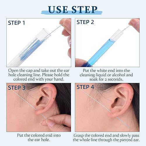 Use Step: Step 1 Open the cap and take out the ear hole cleaning line. Please hold the colored end with your hand. Step 2 Put the white end into the cleaning liquid or alcohol and soak for 2 seconds. Step 3 Put the colored end into the ear hole. Step 4 Grasp the colored end and slowly pass the whole line through the pierced ear.