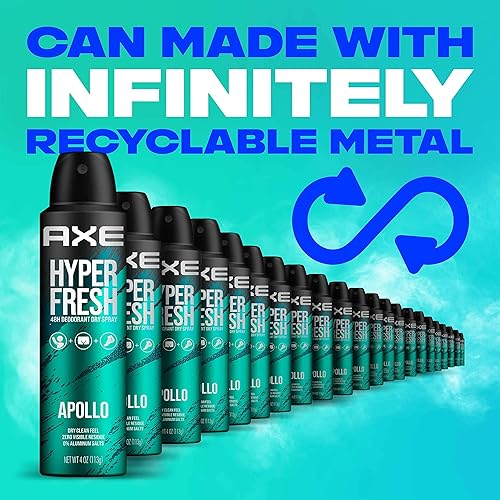 The AXE Hyper Fresh Apollo Dry Spray antiperspirant deodorant for men comes in a can that’s made from infinitely recyclable aluminum