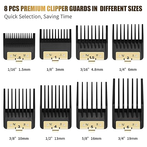 Packing Includes: You get 8 pcs different size clipper guards . Guard Number: #.5, #1 , #1.5, #2,#3,#4,#5,#6,(Length: 1/16 , 1/8 , 3/16 , 1/4 , 3/8, 1/2, 5/8, 3/4inch), providing full The series has options for seamless precision.