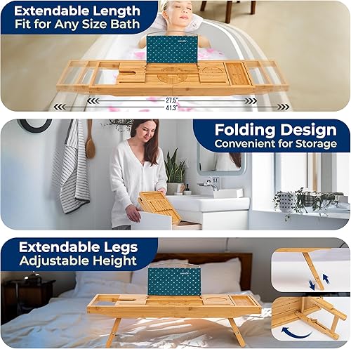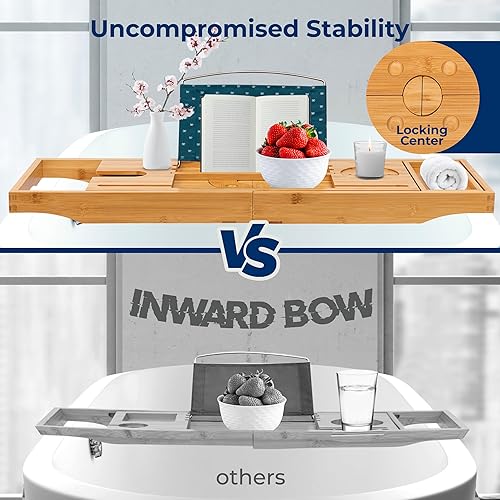 CONVERTIBLE BATH AND BED TRAY: Convert from an elegant bathtub caddy to a food tray for breakfast in bed, laptop tray, organizer tray and more. Non slip rubber sides keep from moving against side of tub
