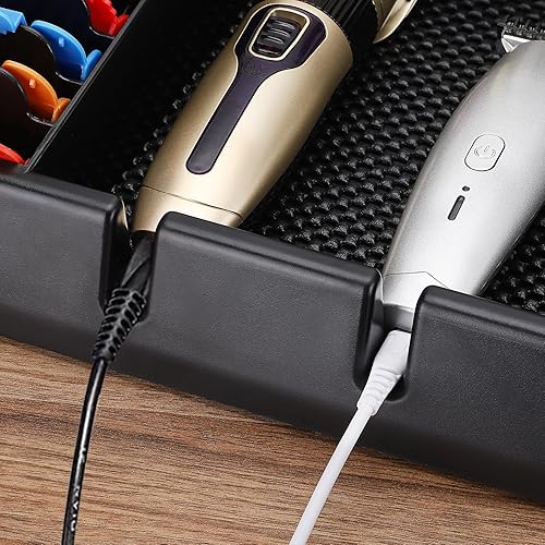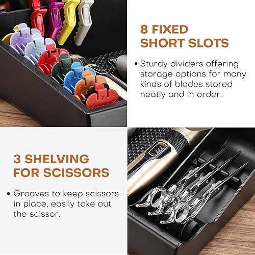 【Everything is Easily Accessible】-- It's designed with 3 tall slots with notches for cord organization, so that your corded clippers can rest in there without the wires getting tangled or in the way. 3 Compartments that hold clippers, shears, razors, combs, brushes, dusters. 8 Custom sized short slots for blades. (NOTE: If you find the cord cutouts a bit narrow, please kindly twist it a bit to get the cord to go in and out of the slot)