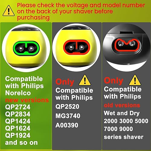 Please note: Not compatible with Philips QP2520(4.3V), QP2630, HQ8505(15V), HQ850, HQ840(8V), QP6520(Please check your shaver model and our charger plug carefully before purchasing. If your shaver is not included in our list, please contact our customer service for confirmation before purchasing.)