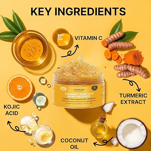• Improve Skin Texture: Our exfoliator for bikini area features superfine sea salt and sugar particles that exfoliate the delicate bikini area without causing irritation—perfect for even sensitive skin. Infused with a unique, uplifting turmeric aroma, this scrub awakens your senses, revitalizes your skin, and leaves you feeling serene, fresh, and beautifully renewed.Use it with confidence, because your skin deserves the best care everywhere
