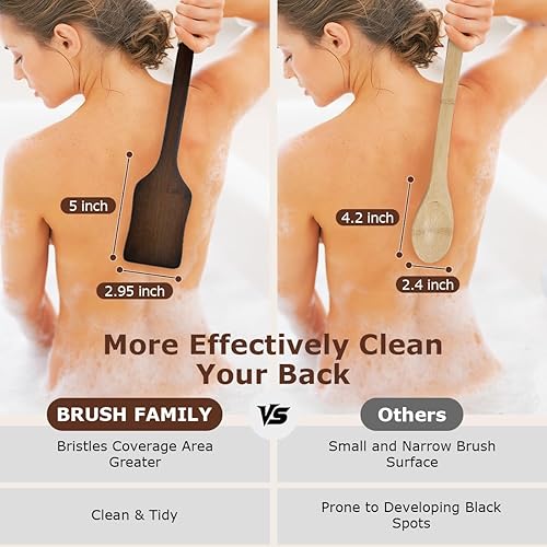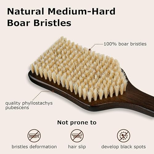 [Natural & Harmless Material] This shower brush for back made with natural boar bristle and high-quality phyllostachys pubescens, the medium-stiff boar bristles are durable and resist deformation, that sweep away the dirt, dead skin and excess oil effectively to prevent body acne and keep smoother and cleaner skin. It is a reliable back brush for shower and dry brushing body brush