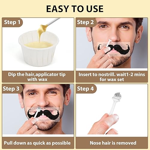 Easy to Use: Nose wax hair removal with easy steps: 1. Melt the nose wax beads in the microwave or hot water; 2. Dig and rotate the applicator to stick the proper amount of hard wax, not too much or too little; 3. Insert it into nose, slightly rotate the nose wax stick, and push the nose wing; 4. As the wax harder, hold the nose with one hand and pull down quickly