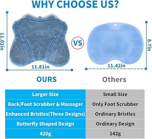 [LARGE BUTTERFLY FORM DESIGN]: Experience total back & body care with our Premium back & foot scrubber in shower(11.81" W x 11.02" L) outperforms regular silicone back scrubbers with its spine-hugging butterfly shape – engineered for full-back contact that glides across every curve, delivering deep exfoliation + invigorating massage.
