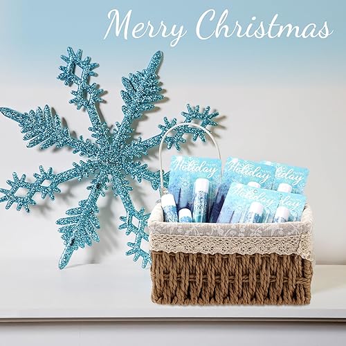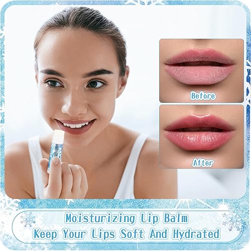 Snowflake Lip Balm Christmas Favors: includes 24 individually wrapped lip balms, each featuring festive blue and white snowflake designs and the cheerful message “Merry Christmas”; A simple yet joyful gift to warm hearts during the holiday season