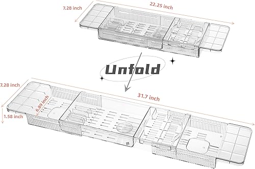 DESIGN:bathtub tray table is extendable, with a unfolded length of 31.7 inches, suitable for most bathtubs(bathtub with internal width of up to 29.5 inches). When retracted, the length is 22.3 inches, making it convenient to store and save space when not in use.