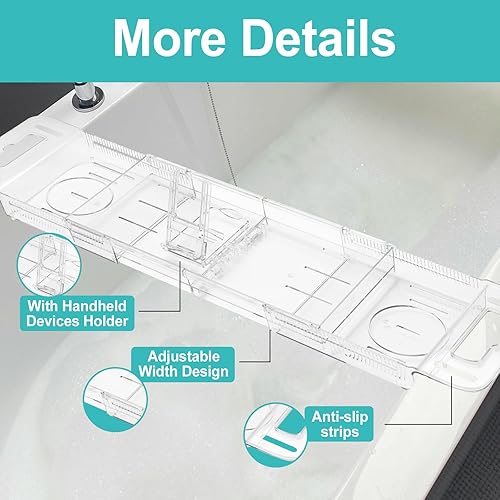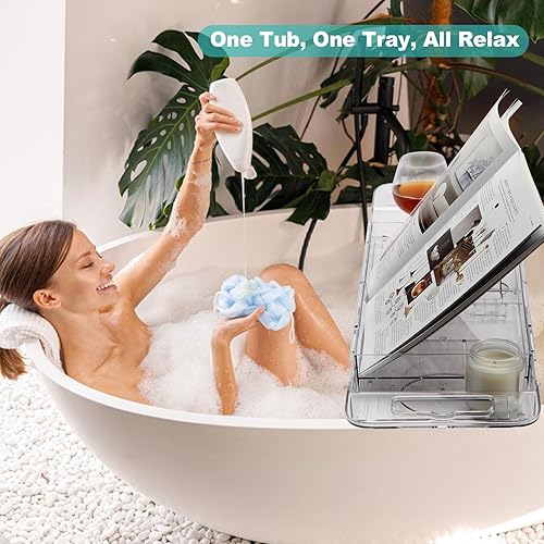 [Enjoy A Home Spa Bath]: This bathtub tray is designed for a relaxing bath. Bath tray for bathtub is equipped withan adjustable phone/tablet holder, and easily hold your bubble bath, bath salts, aromatherapy candles, wine glass, soap, moisturizer, essential oils, and skincare essentials—creating your own spa experience at home