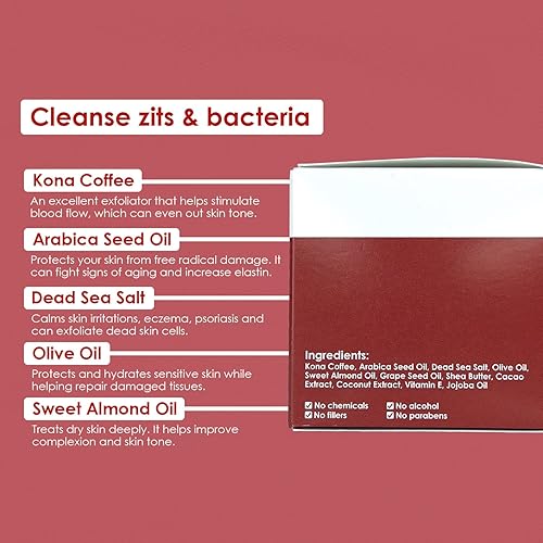 Exfoliates Dead Skin: Dead sea salt and kona coffee are antioxidants that work together to improve the appearance of skin. These cleansing and moisturizing effects help soothe and emphasize healthier skin.