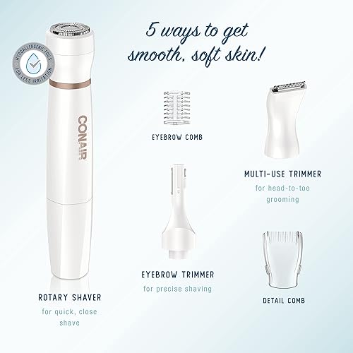 Four Interchangeable Attachments: an ear/nose trimmer, an eyebrow trimmer, hypoallergenic rotary shaver for removing fine facial hair, and a multi-use trimmer.
