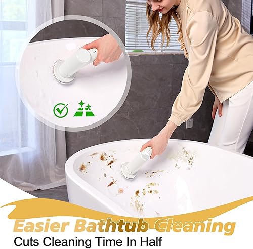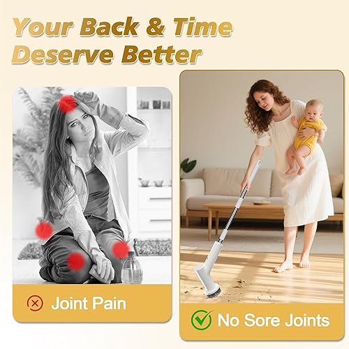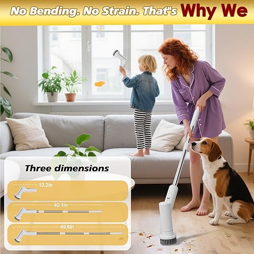 【Adjustable Handle】We’ve upgraded our bathroom cleaning brush with 3 adjustable designs handle and 3 lengths: 11 in, 41 in, and 51 in. Simply twist and pull to adjust or remove each extension rod. Whether you need a handheld cleaning brush or a shower scrubber with long handle for bathroom and bathtub, you can clean every corner without bending or kneeling. bathroom scrubber electric ergonomic design protects your back and joints, perfect for seniors or anyone with mobility issues, so you save time and effort on every task.