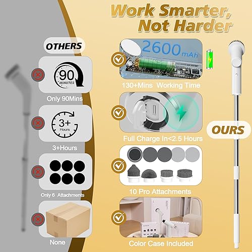 【Save Time and Effort】Our electric spin scrubber bathroom uses advanced lithium-ion battery technology and is equipped with 2600 mAh battery and 2.5-hour quick charge, delivering up to 150 minutes of runtime. No more frequent recharging whether you use it as an shower scrubber or a bathtub scrubber, you can clean with confidence.