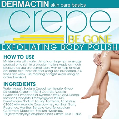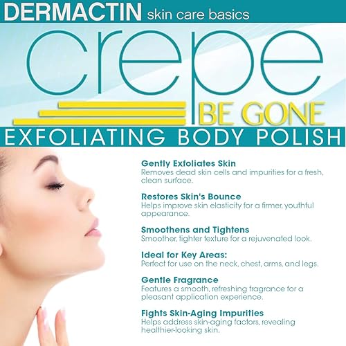Dermactin’s Exfoliating Body Polish is specifically developed to exfoliate and smooth dull, saggy, crepey skin on areas like your neck, chest, arms and legs.