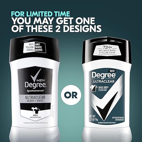 Product 2: WHITE SHIRT, BLACK SHIRT, NO PROBLEM: Degree UltraClear Black+White Antiperspirant Deodorant delivers 72-hour sweat and odor protection with anti-white marks and anti-yellow stains technology