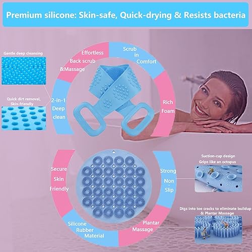 【Quality Materials】Our shower mat set is made of high quality silicone,soft and comfortable,not easy to deformation.Easy to clean and dry.The back scrubber with strong handles make it easy to grip, and scrubbing is no longer difficult. the foot scrubber Engineered with thousands silicone bristles,it can produce rich foam and give you a better bathing experience.