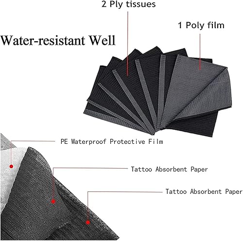 The tattoo bib has good absorption of liquids and moisture, and the polyethylene film provides a waterproof layer.